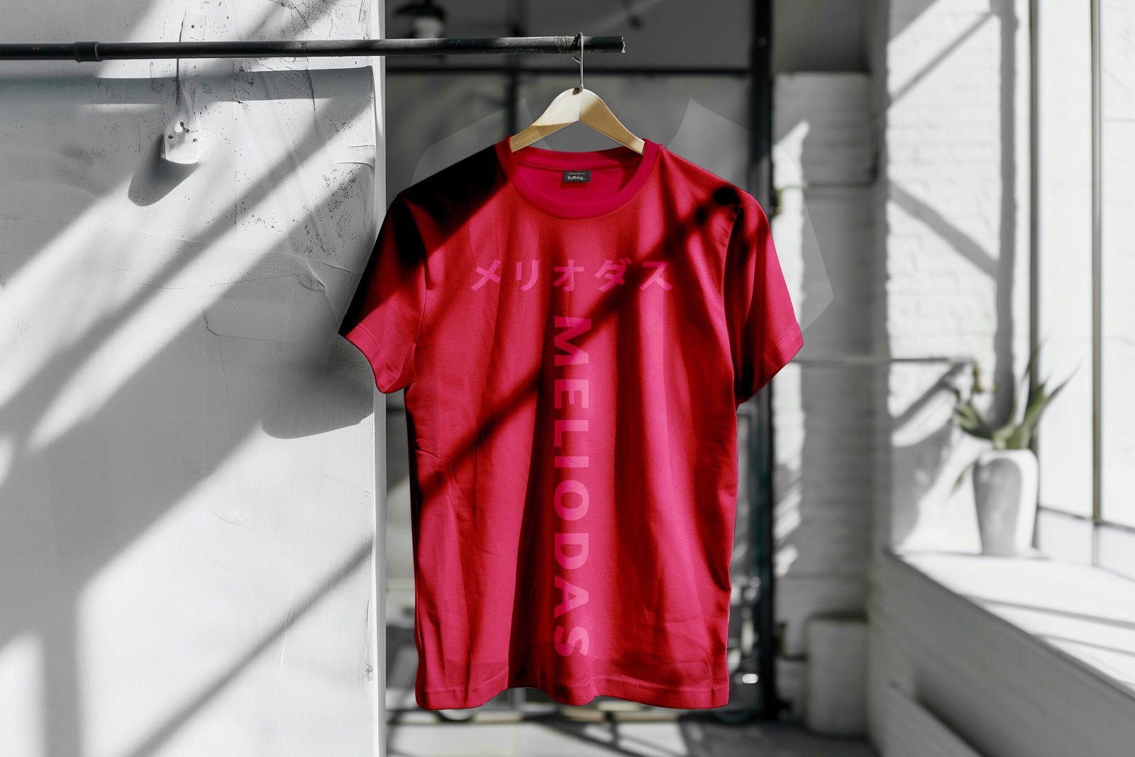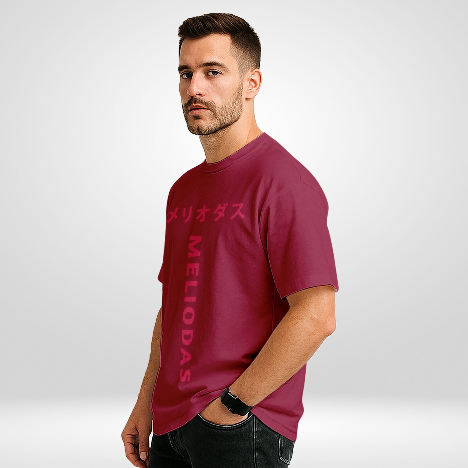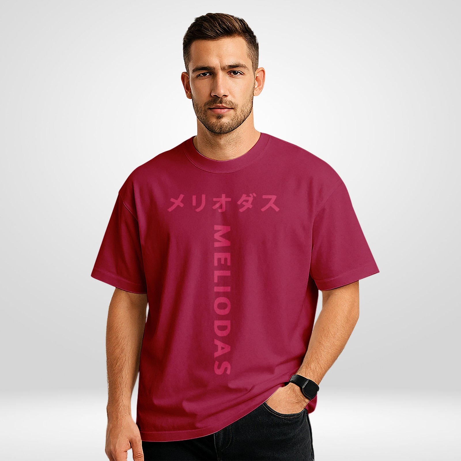 This t-shirt keeps things clean and cursed. The front print features vertical “MELIODAS” text with matching Katakana above, giving it anime-authentic flair. Flip it around and you’ll see a large, shaded silhouette of Meliodas’ demon mark and iconic smirk—bold, mysterious, and totally Buffring. The maroon base fabric (#8e1e3c) gives this piece a royal yet rebellious tone.