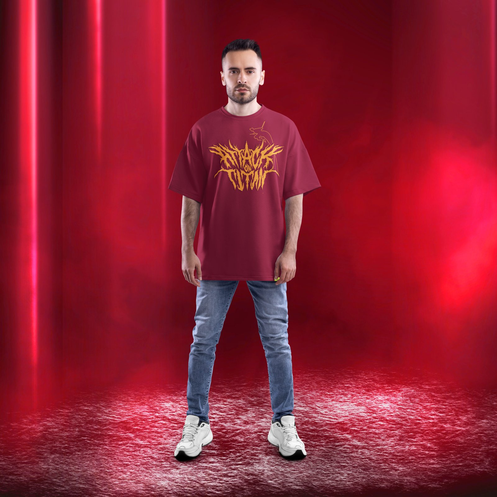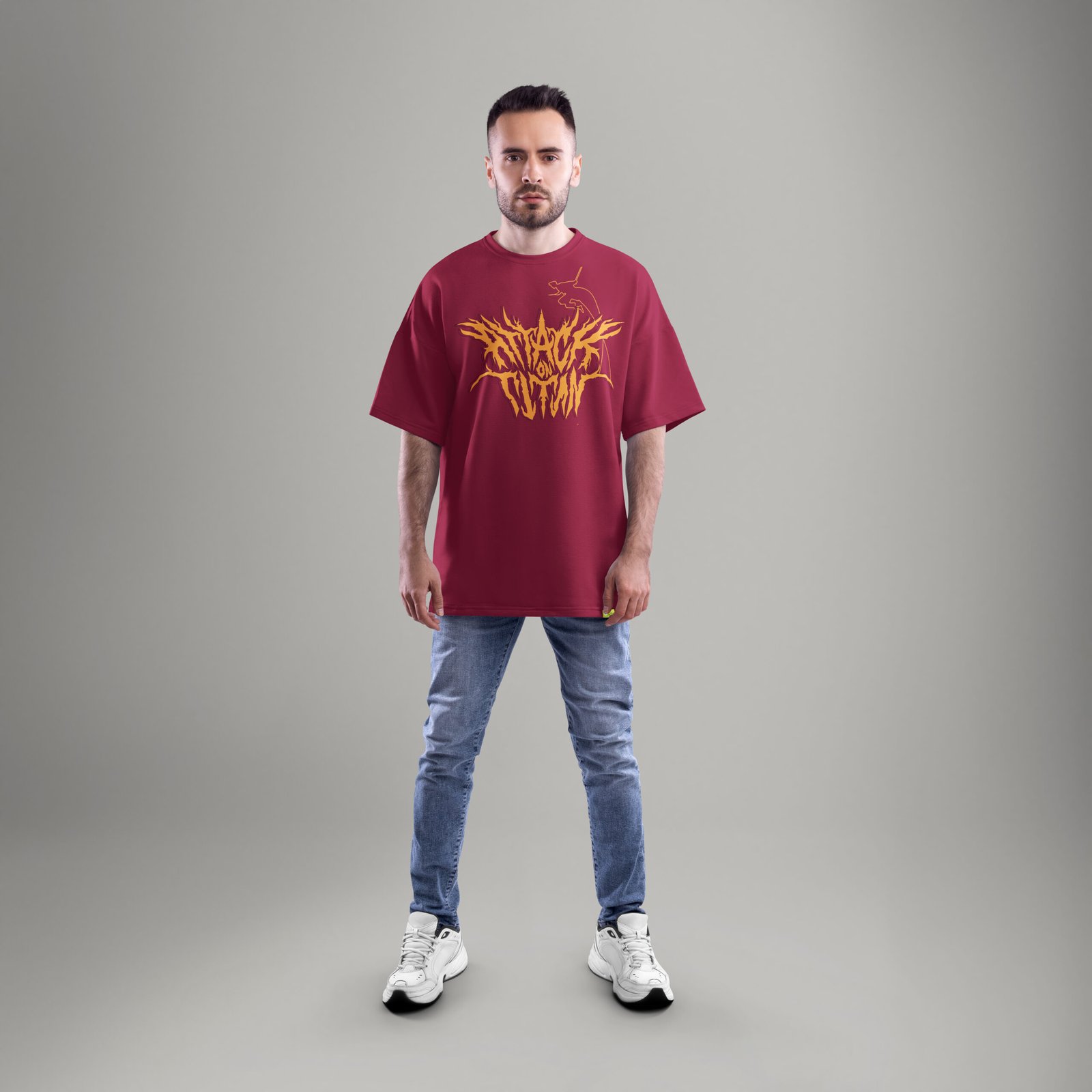 Pair your Colossal Titan Oversized T-Shirt with black joggers or ripped denim for a rugged streetwear look. Add high-top sneakers, a silver chain, and a dark bomber jacket for that post-apocalyptic AOT aesthetic. For casual weekends, it layers perfectly with oversized flannel shirts or a simple hoodie underneath.