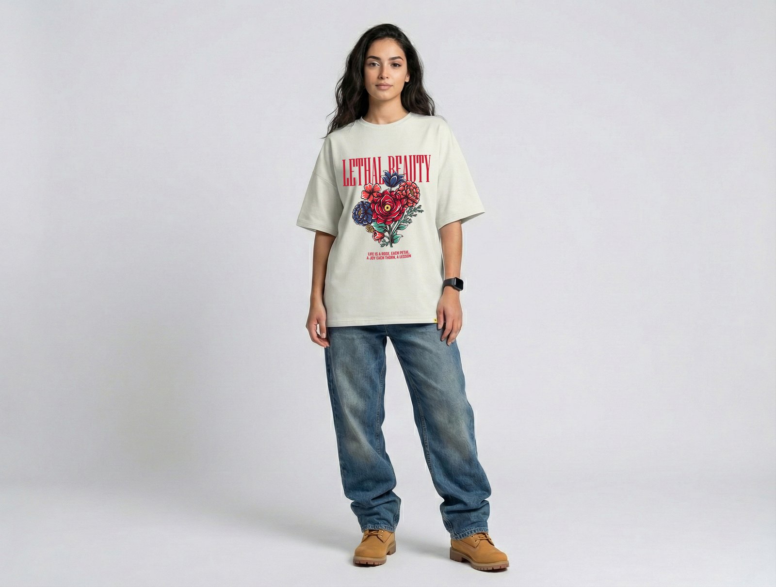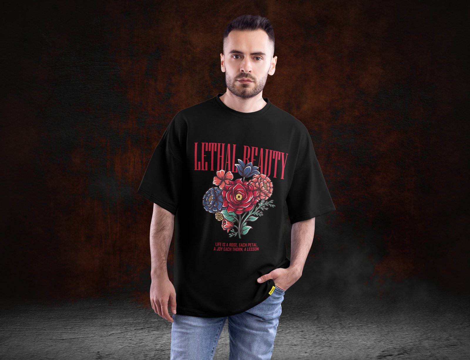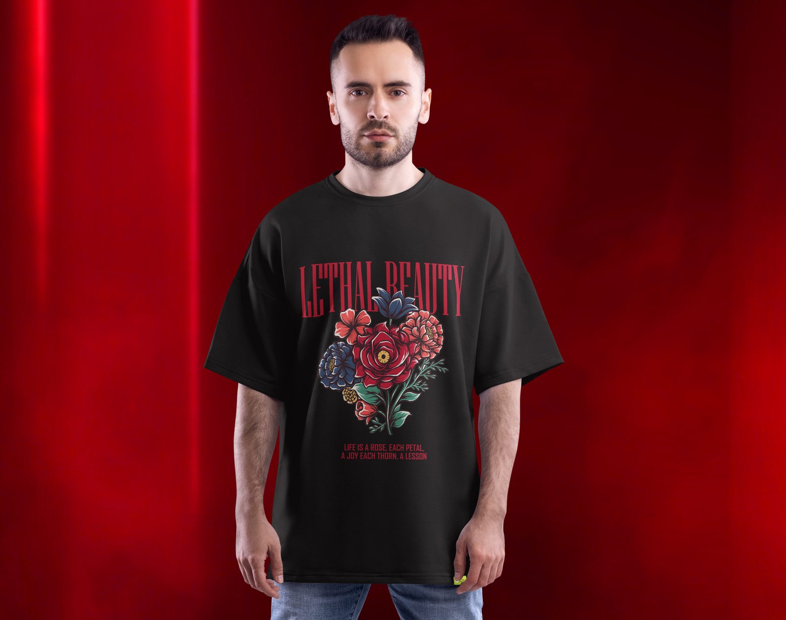 For accessory lovers, minimalism works best — let the floral artwork take center stage. The Lethal Beauty Unisex Oversized T-Shirt is equally versatile for day-to-day wear, evening gatherings, or creative environments where individuality is valued. Its bold visual statement complements confidence and originality.