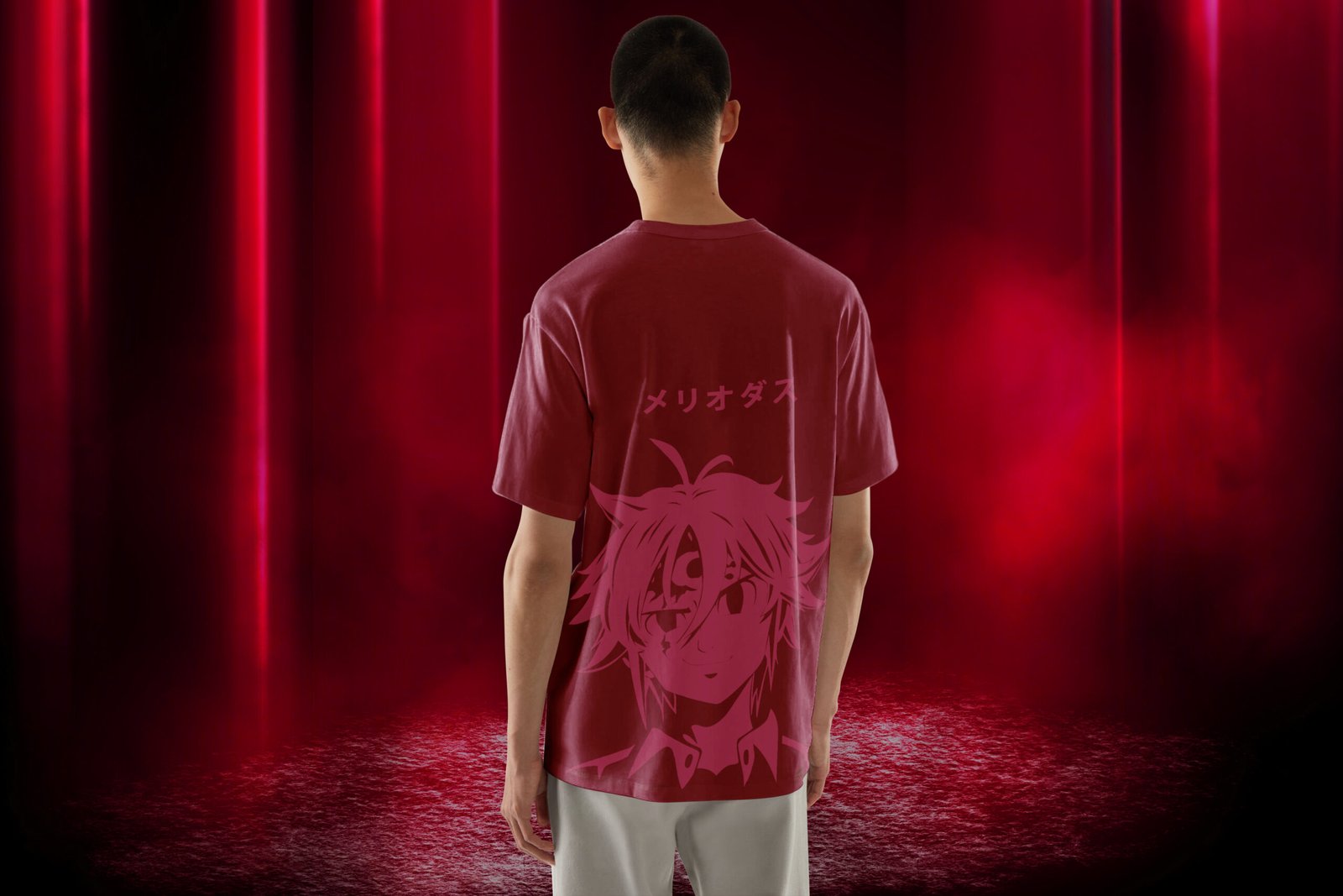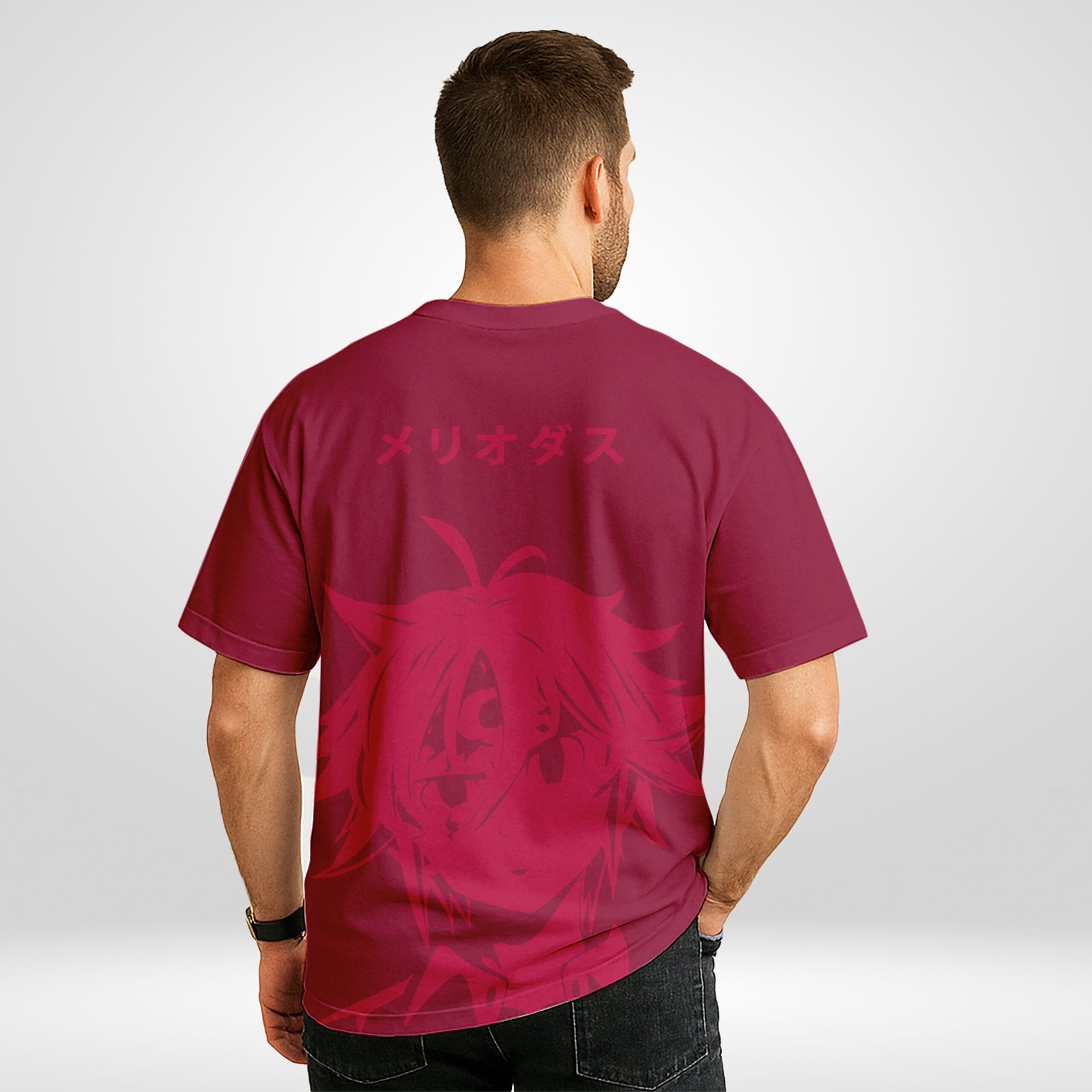 This t-shirt keeps things clean and cursed. The front print features vertical “MELIODAS” text with matching Katakana above, giving it anime-authentic flair. Flip it around and you’ll see a large, shaded silhouette of Meliodas’ demon mark and iconic smirk—bold, mysterious, and totally Buffring. The maroon base fabric (#8e1e3c) gives this piece a royal yet rebellious tone.