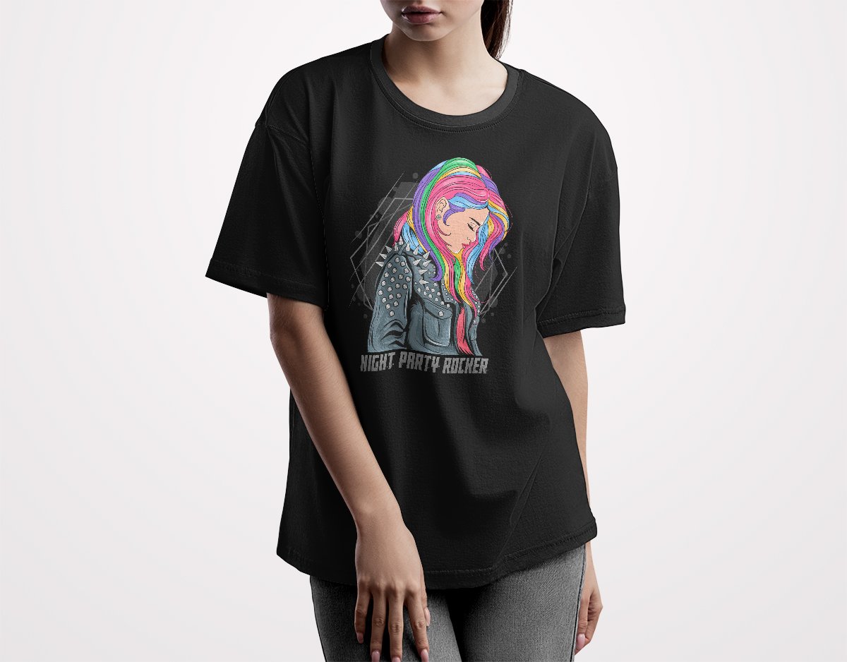 The design of the Night Party Rocker Oversized T-Shirt combines vivid artistry with modern streetwear aesthetics. The central image – a rebel girl with flowing rainbow neon hair – explodes with color against the deep black cotton canvas. She’s dressed in a studded leather jacket, giving off a powerful mix of punk and glam vibes. Behind her, sharp geometric accents create a sense of depth and movement, making the graphic almost come alive under club lights. The “Night Party Rocker” typography anchors the artwork with a confident, metallic-style font, adding that final touch of concert poster allure.