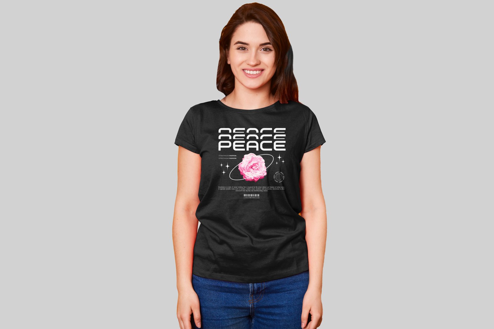 The black backdrop does more than provide contrast – it enhances the versatility of the Peace Blossom T-Shirt. Black is universally flattering, slimming, and pairs effortlessly with almost any other color, making this tee a reliable foundation piece in your wardrobe. The floral element introduces a gentle pop of color, ensuring the t-shirt stands out even in minimalist outfits.