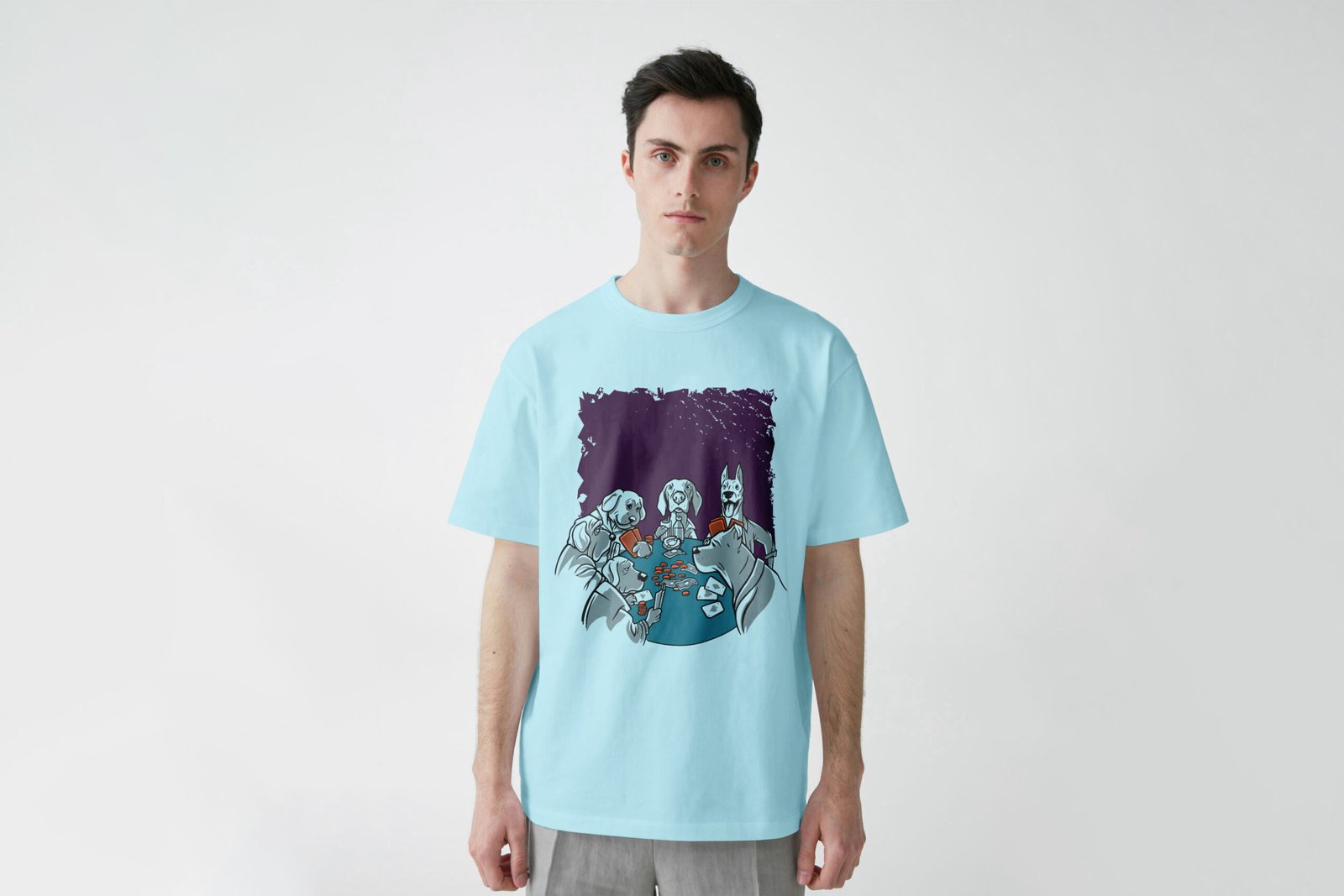 Let your tee do the talking. This sky blue Dog Streetwear T-Shirt blends street cool with a dose of canine mischief. A pack of dogs locked in a poker game—made for players only.